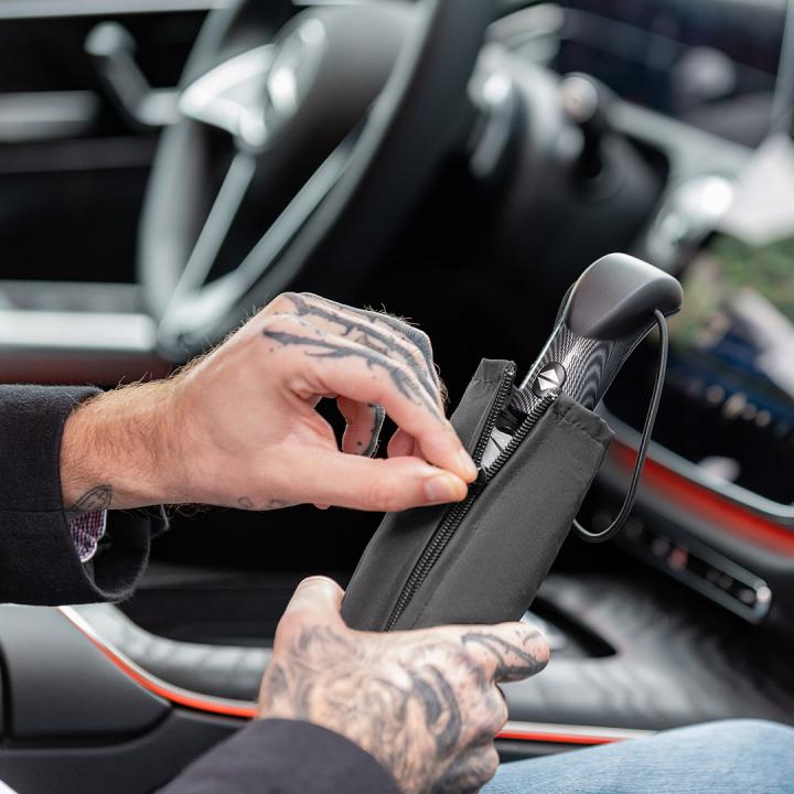 Äußerst stabiler Doppelautomatik-Taschenschirm in Übergröße mit Griff in edler Carbon-Optik