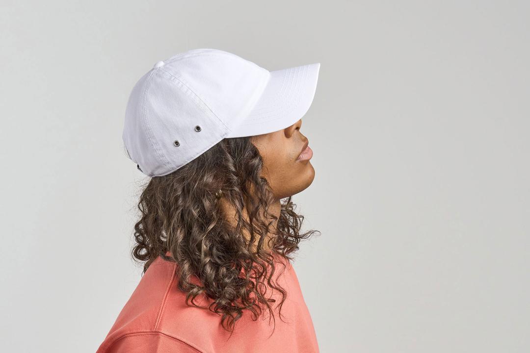 An unstructured baseball cap made from organic and recycled cotton, known for its comfort and softness due to its washed effect. The extra touch? Two distinctive metal eyelets on the sides, a constrasting under visor and an adjustable closure that fits any size.