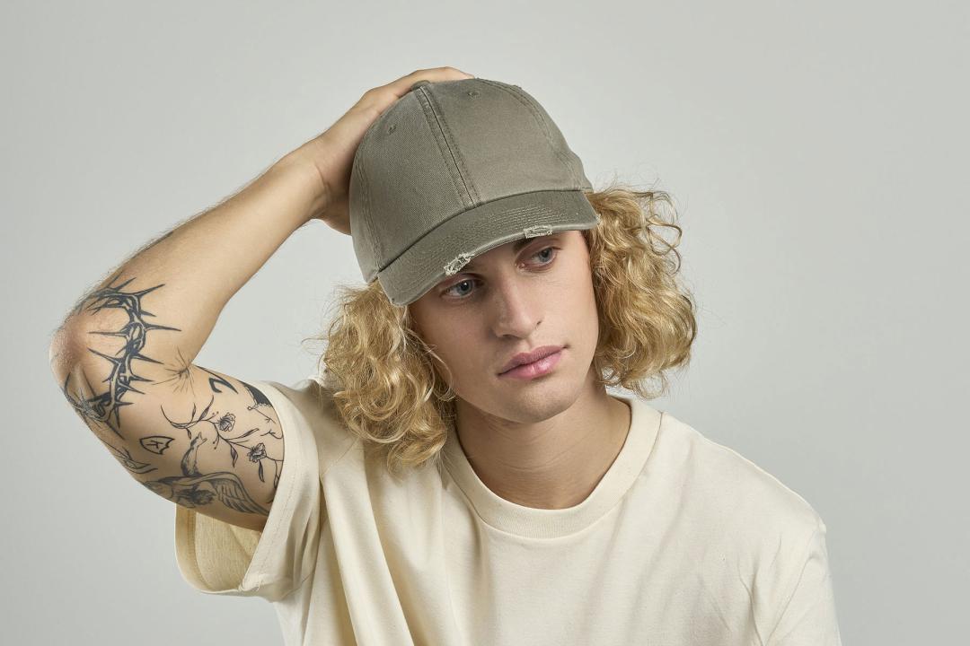 Original dad hat shape with ustructured crown, made of a blend of recycled and organic cotton. Closed at the back by a buckle with metal hole. Rips and cuts on the visor for a vintage and urban look.