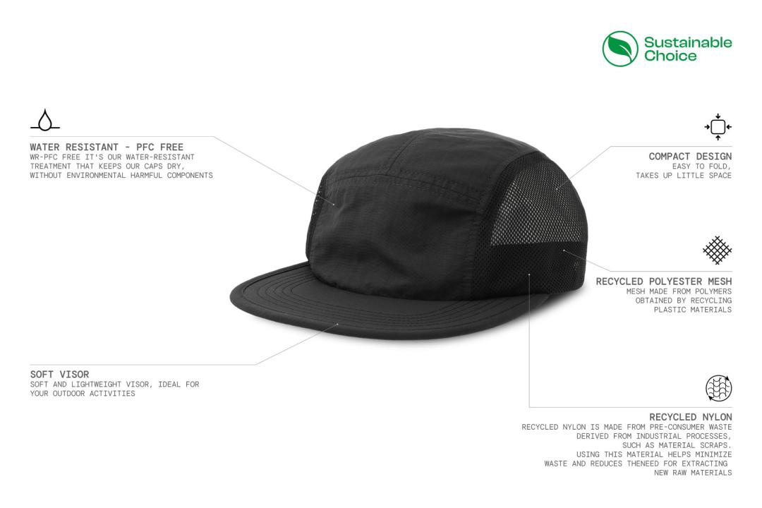 This cap features a compact design, a lightweight foldable visor, water resistance, soft recycled mesh, quick-drying capabilities, and a dry-tech sweatband — everything sports enthusiasts need for optimal performance.
