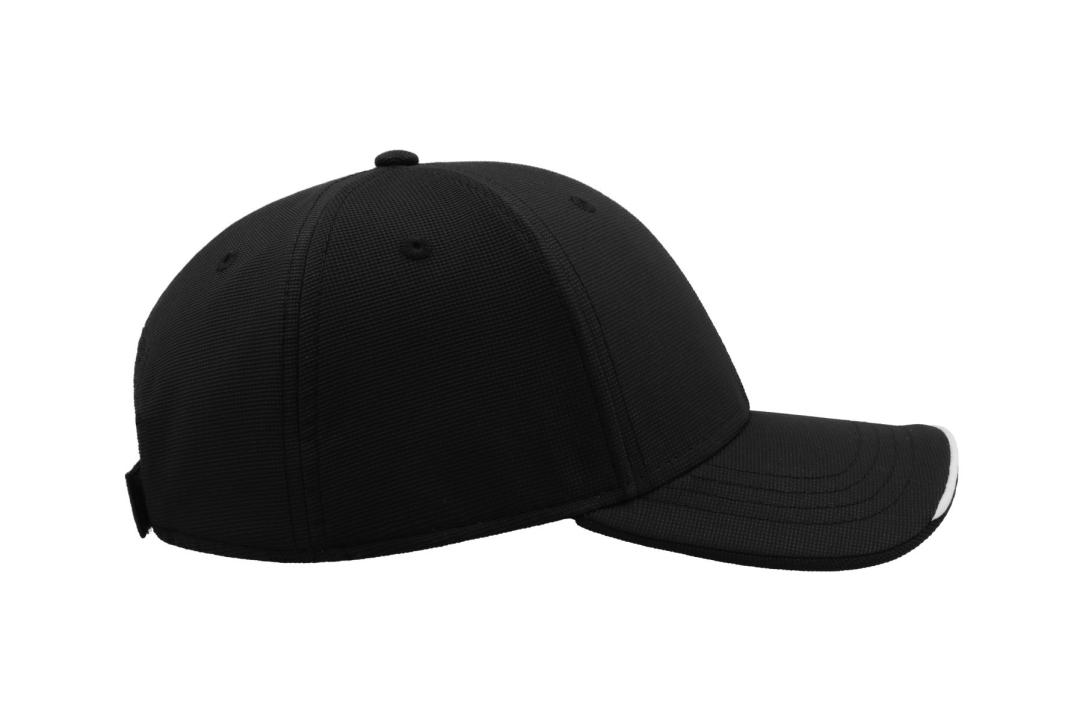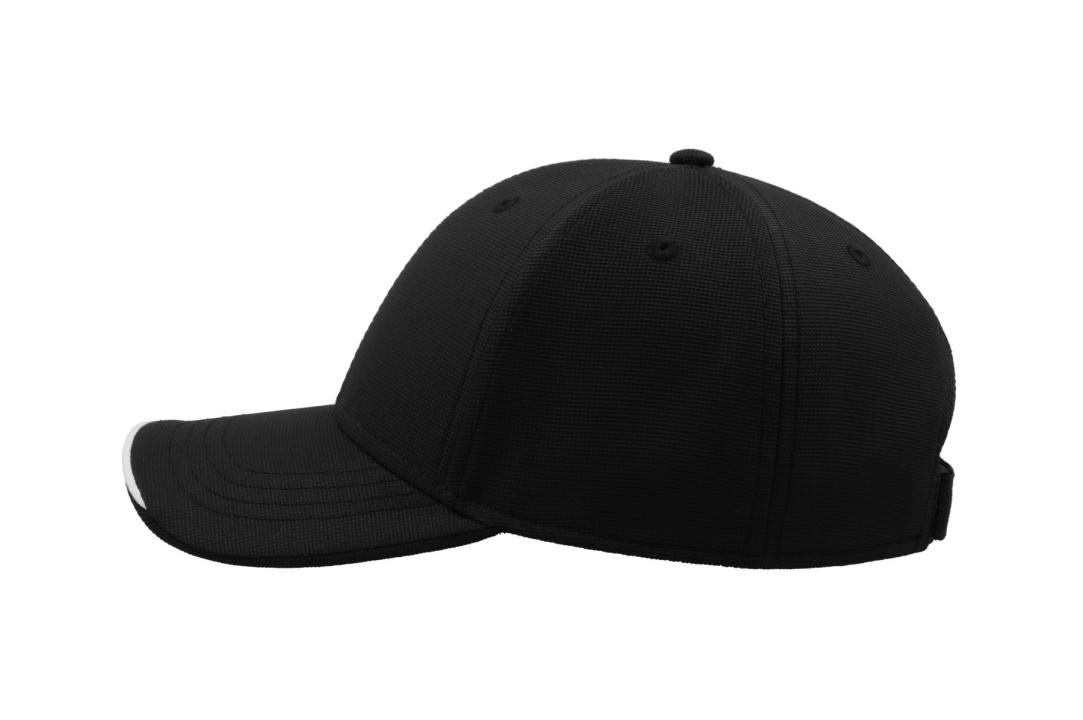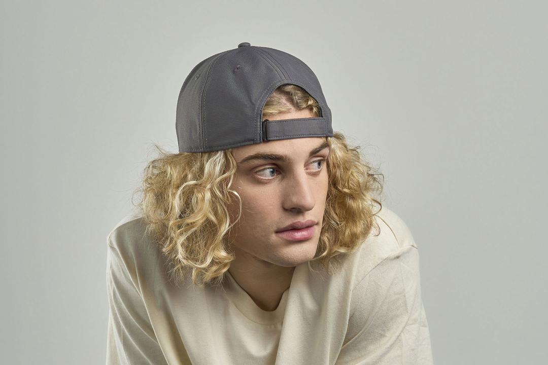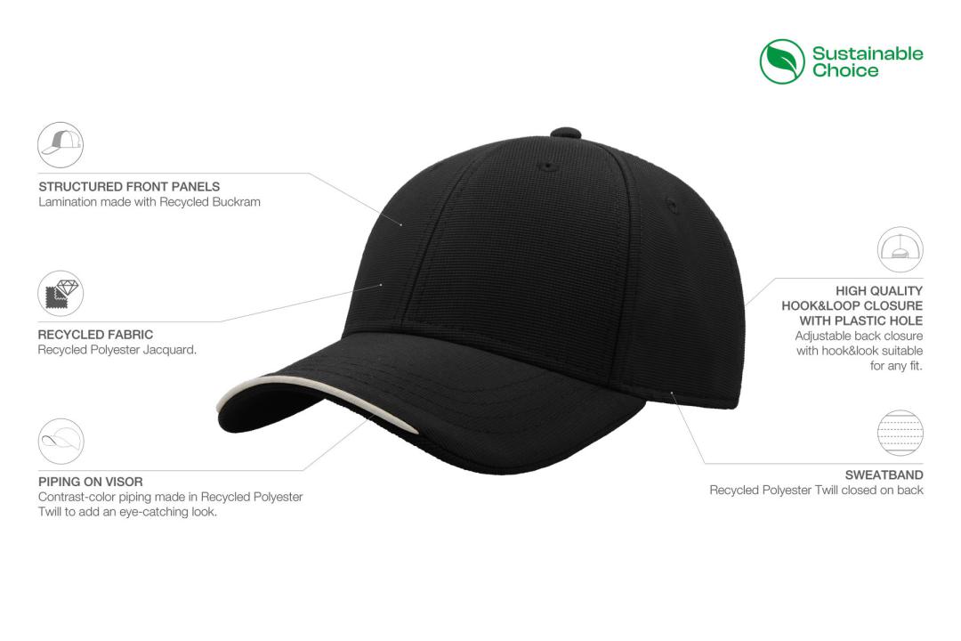 Classic automotive cap revisited in recycled polyester jacquard. Structured shape with HQ hook-and-loop closure with plastic hole. Curved visor with contrasting piping insert, typical of the automotive world.
