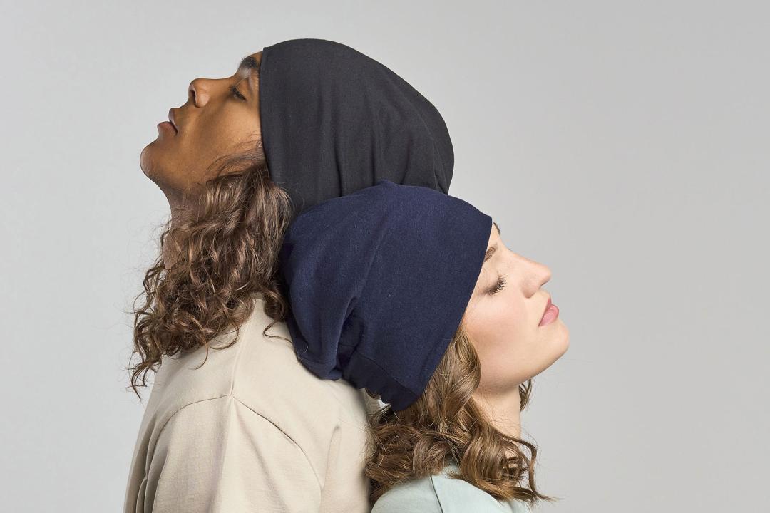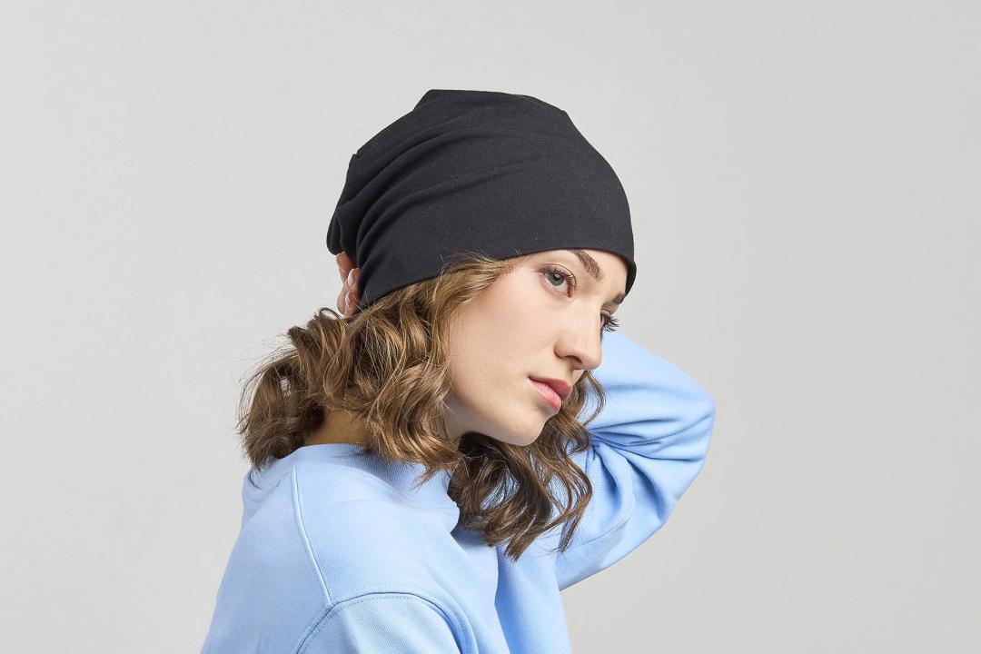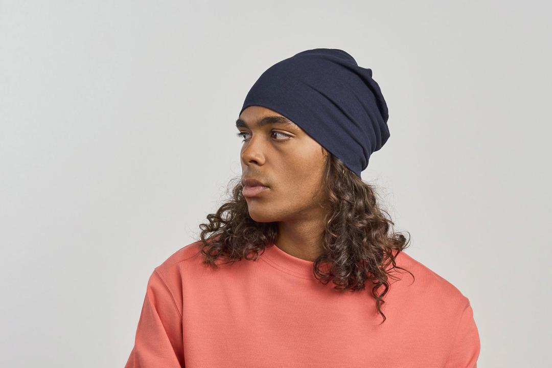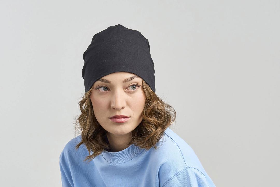A sporty beanie designed with elasticized recycled polyester, perfect for outdoor activities, such as running or jogging.