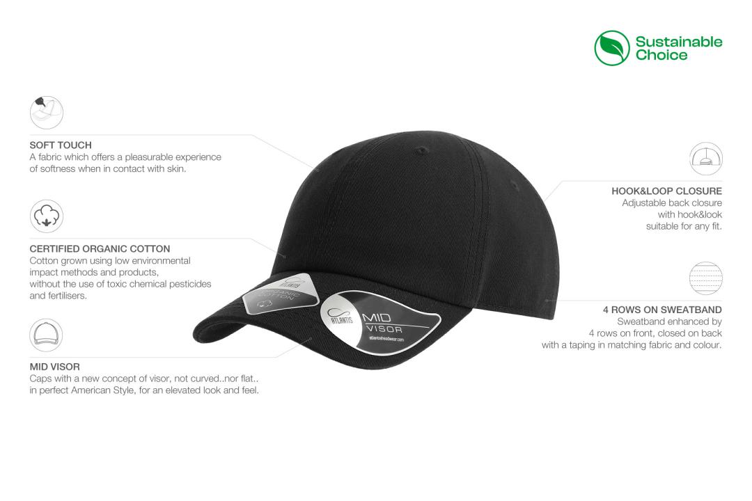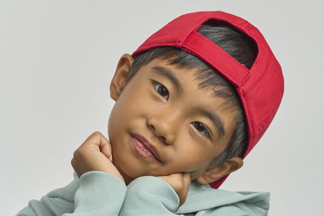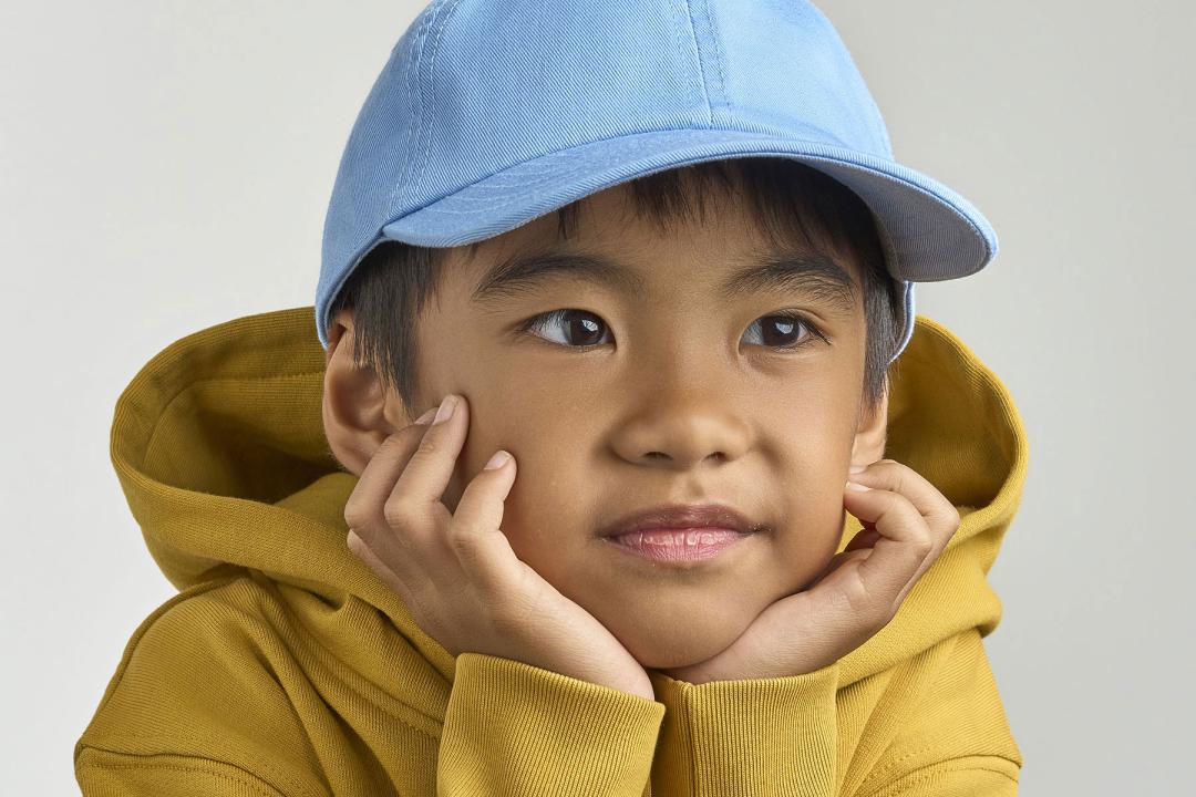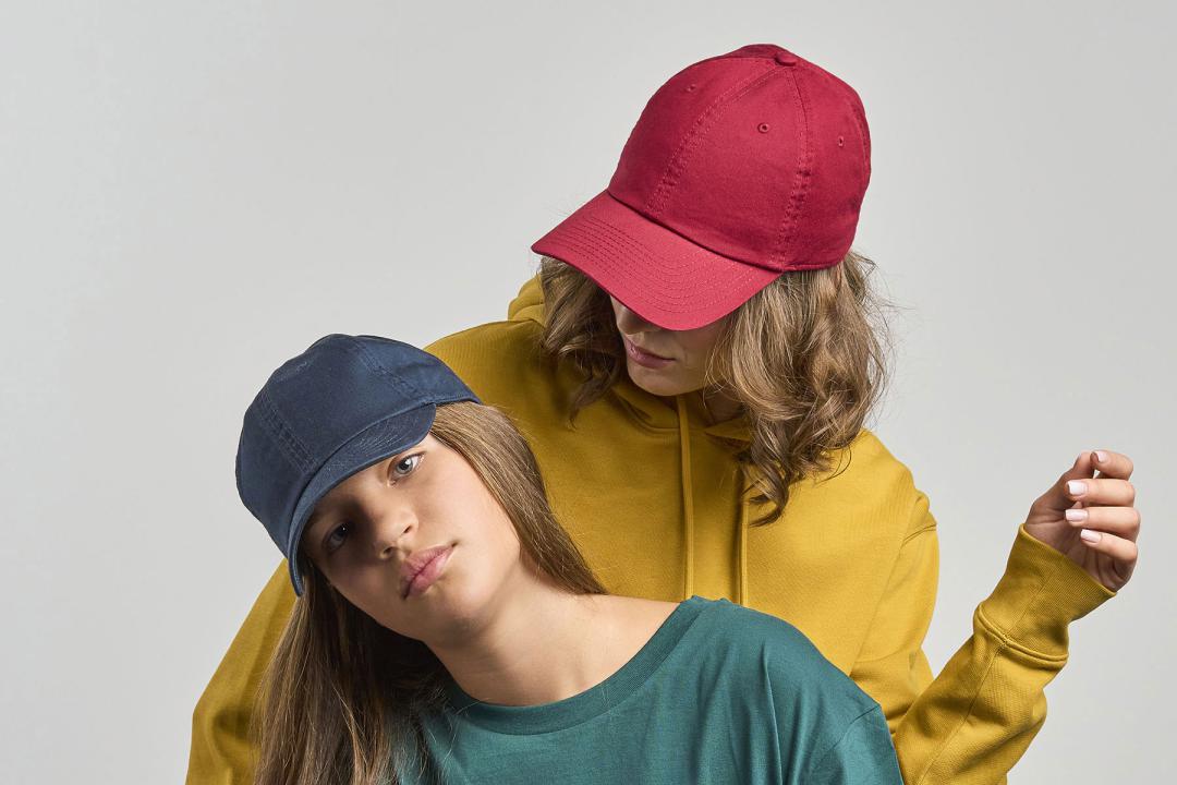 Unstructured 6 panel cap for kids, in certified organic cotton. Dad hat shape with mid visor and hook and loop closure.