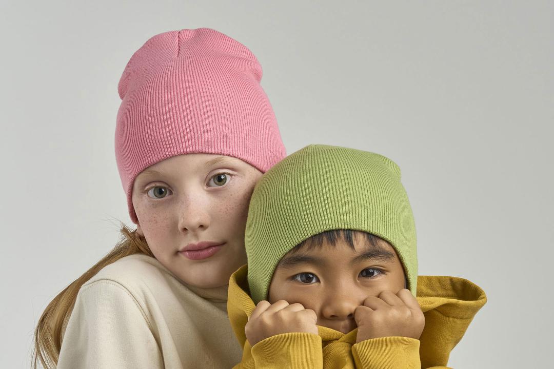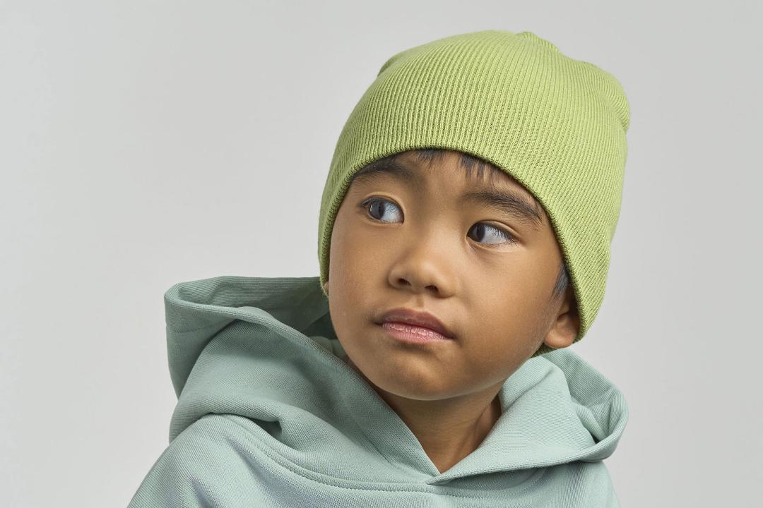 Cozy beanie for kids in 100% certified organic cotton yarn, anallergic and natural fiber. Fine rib knitted made with circular machine.