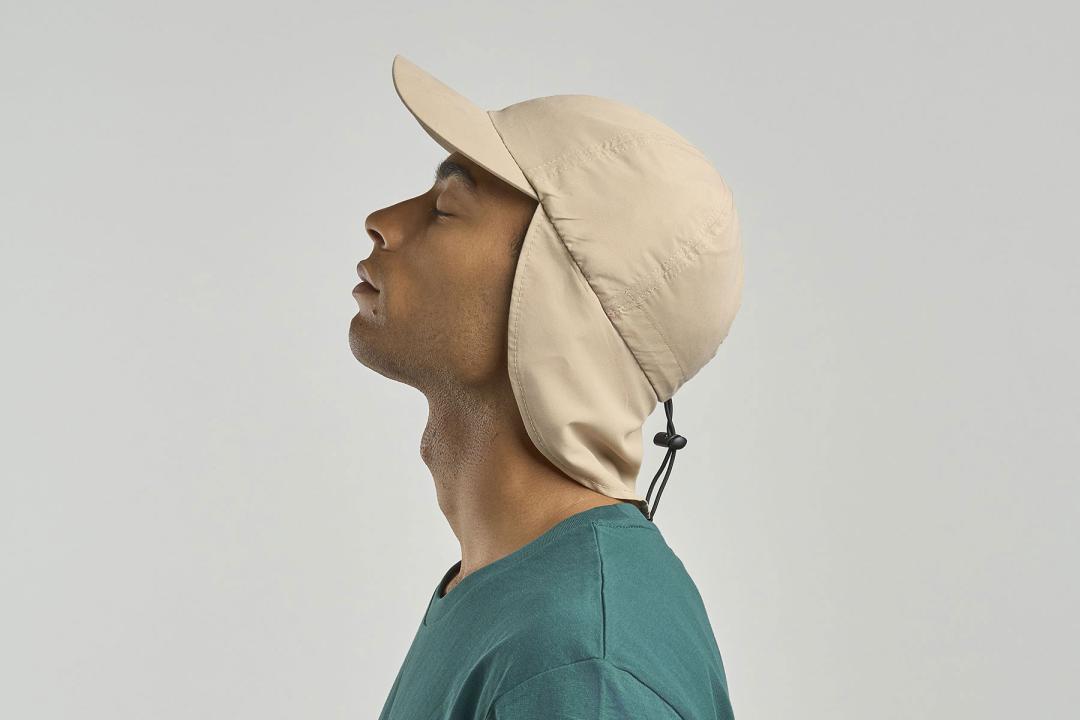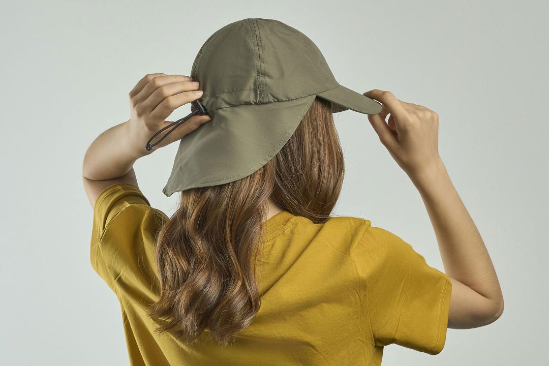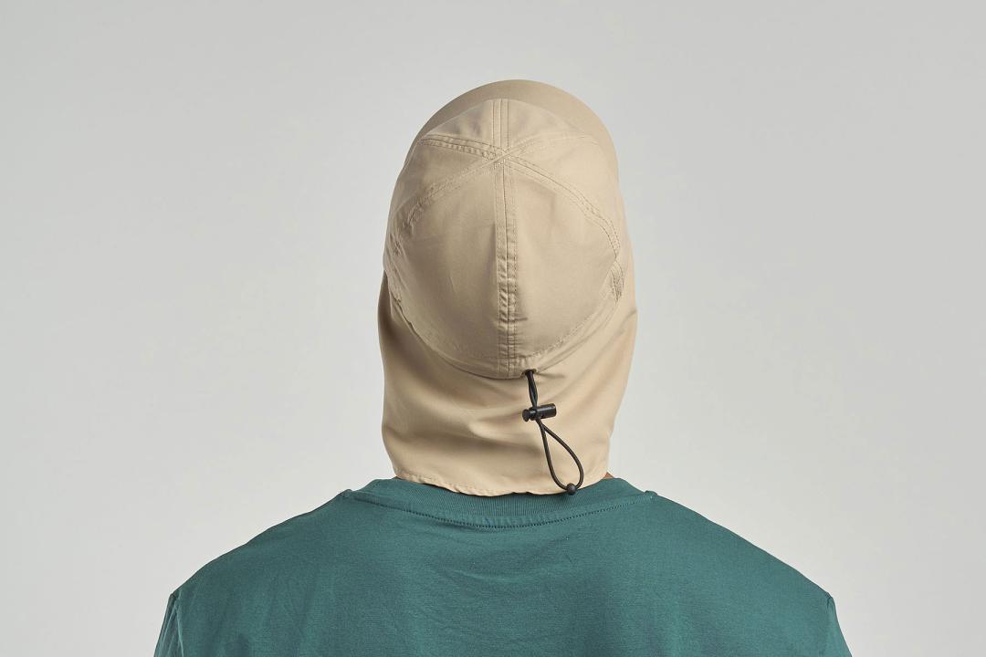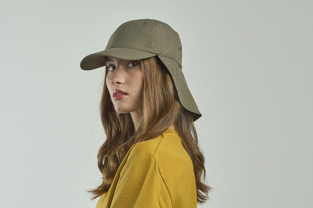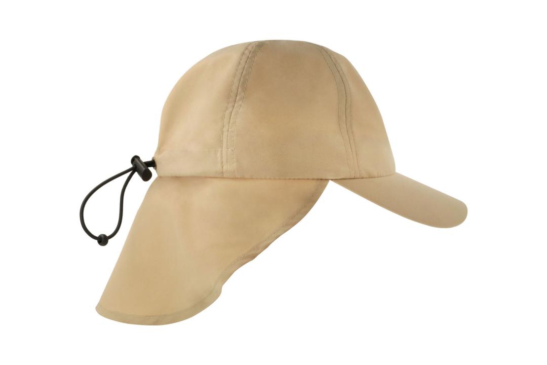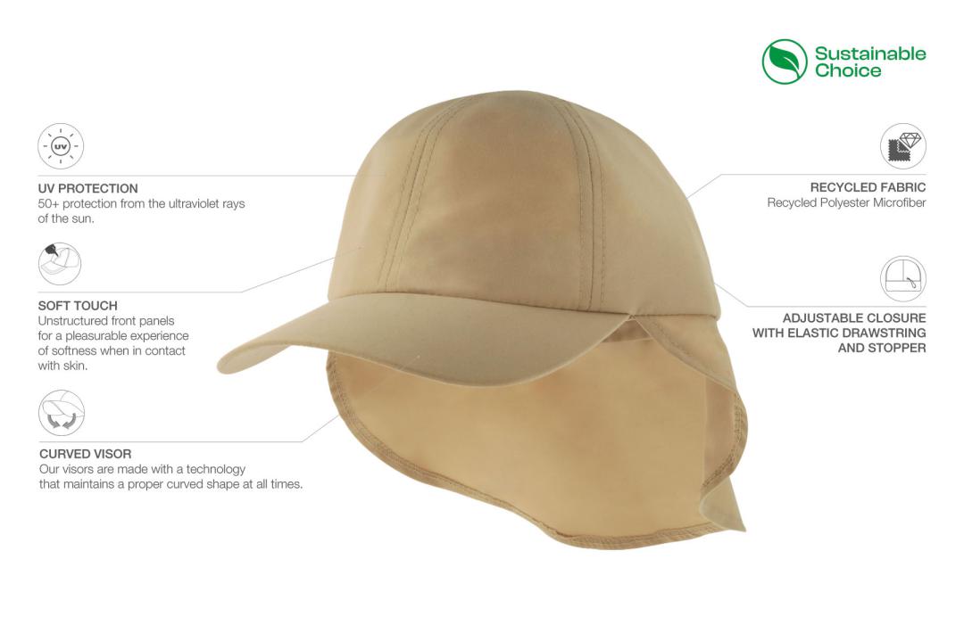 Outdoor trip hat in recycled polyester with UV protection. Unstructured front panels and curved visor. Neck sunshield on the back with adjustable closure with elastic drawstrings.
