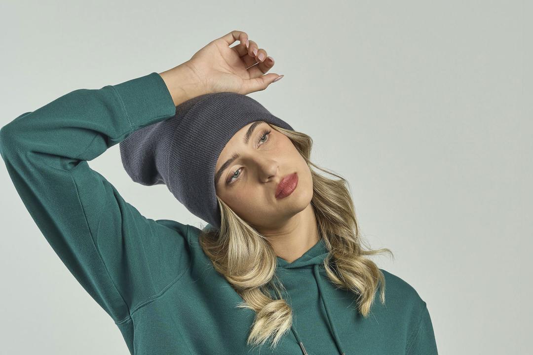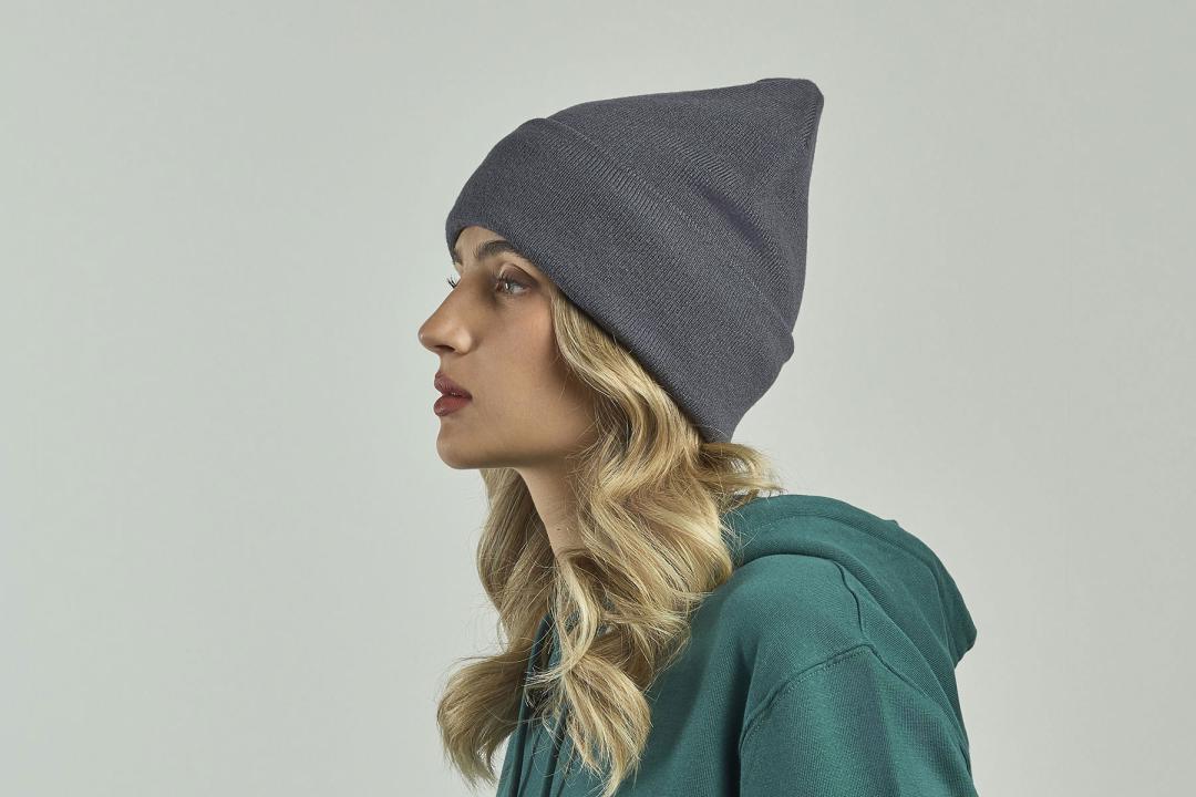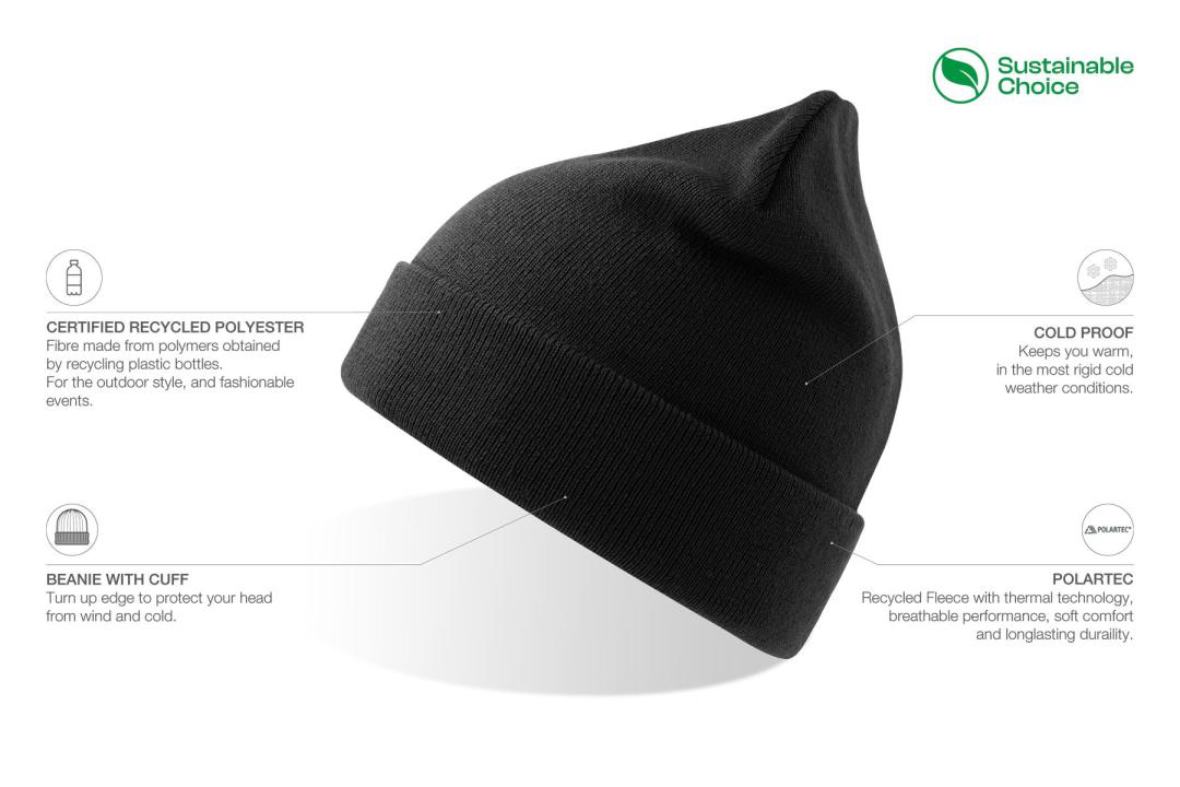 Knitted beanie with cuff, in recycled polyester yarn with recycled polyester inside Polartec® lining.