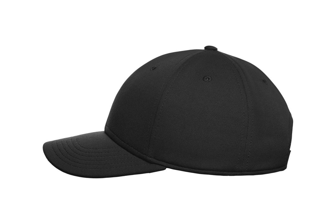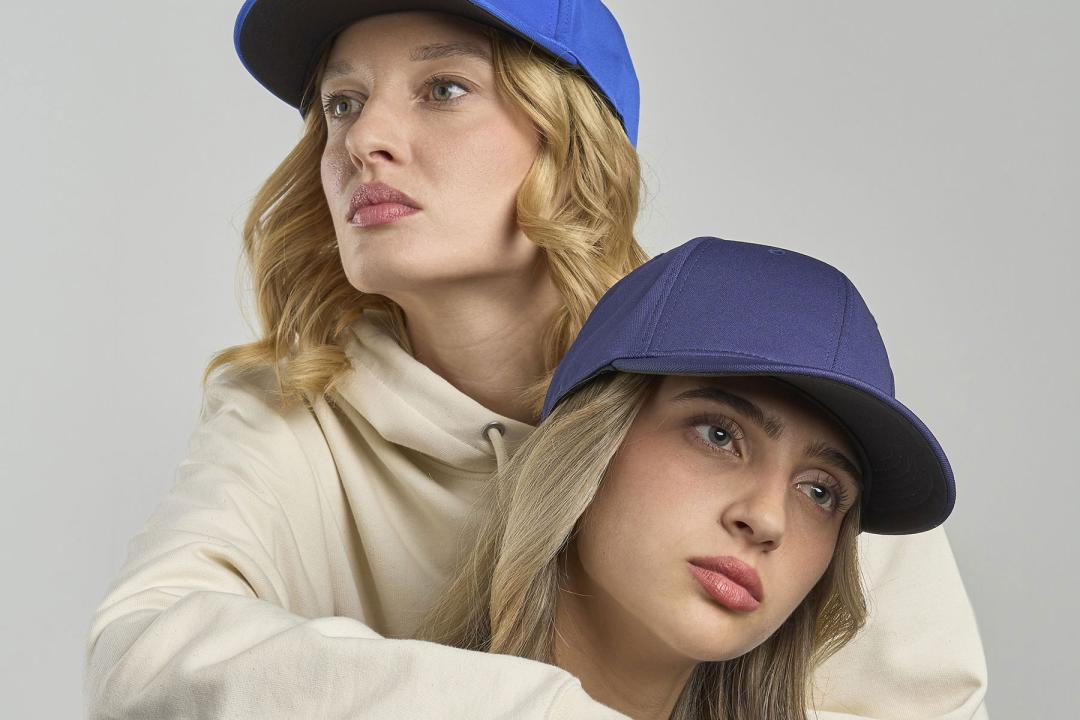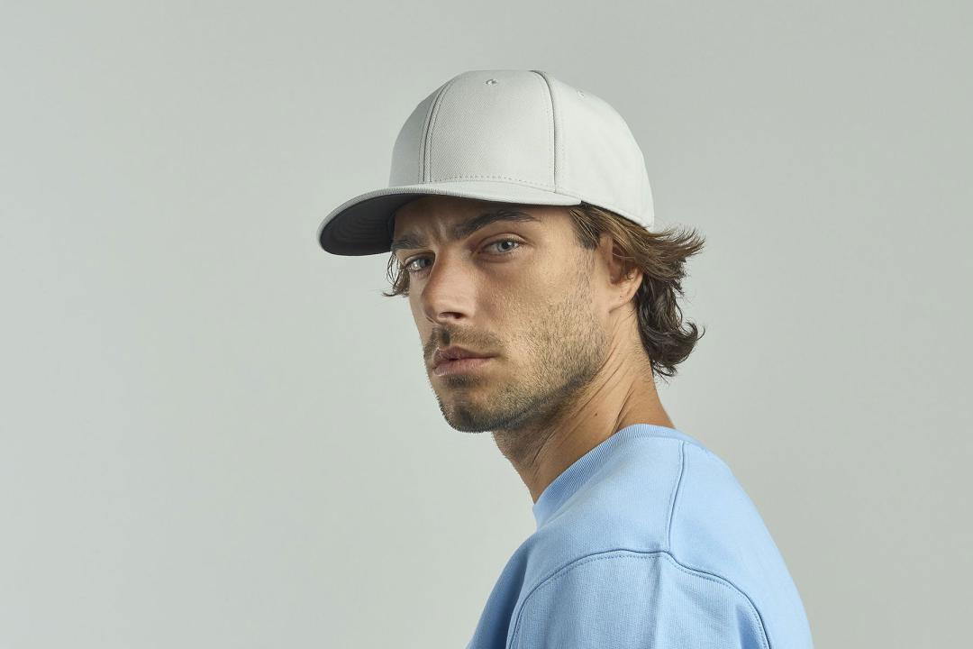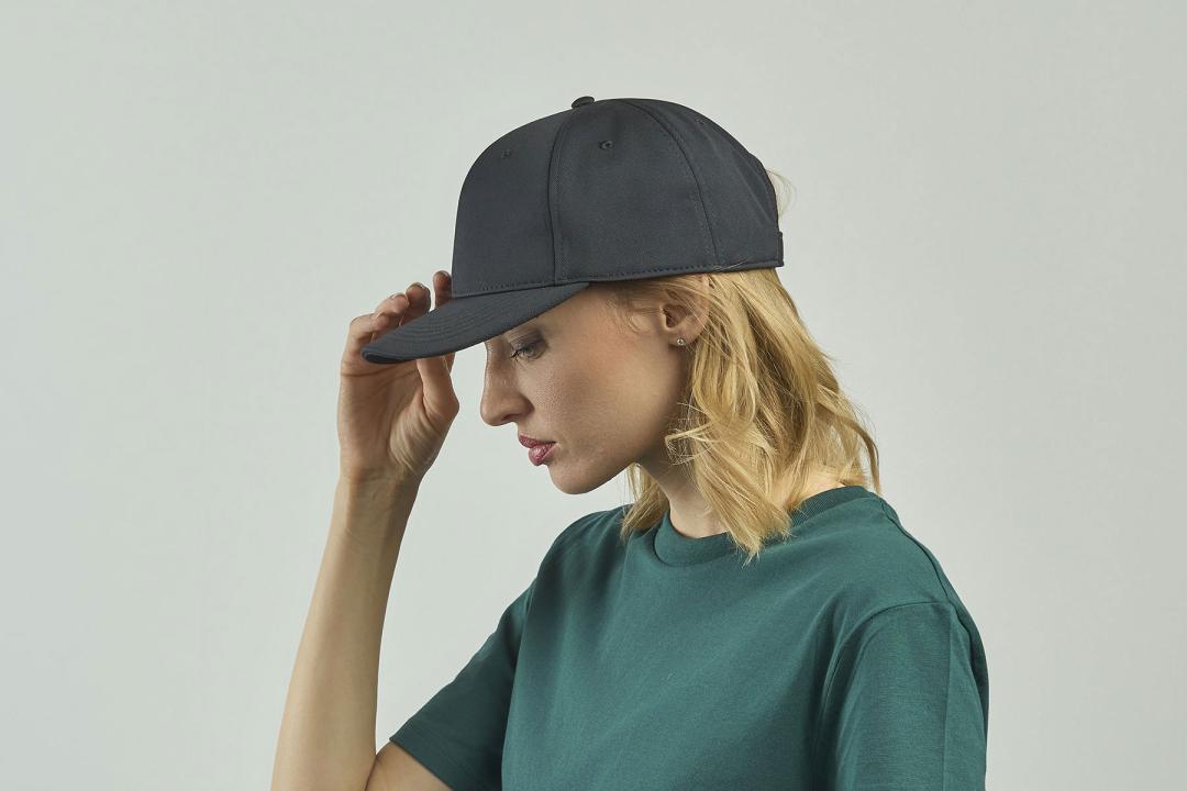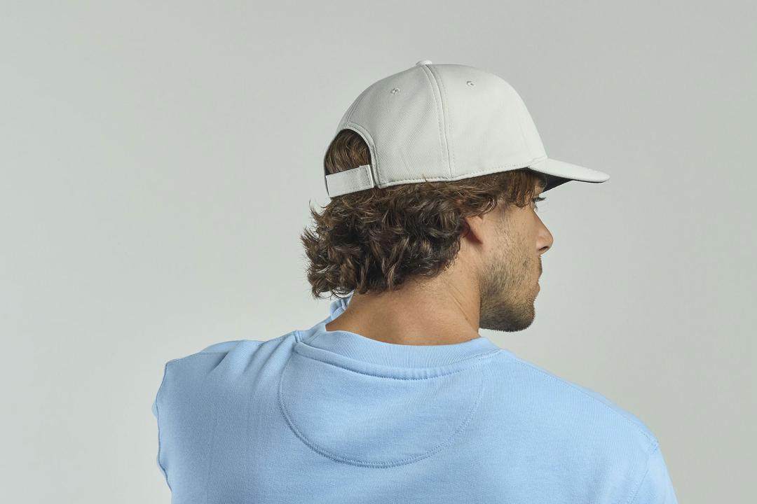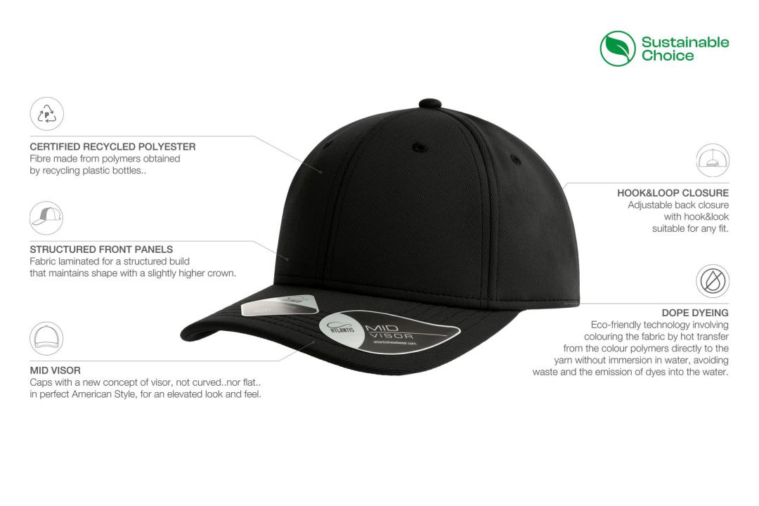 Structured six panel cap made of dope dyed polyester, a certified recycled fabric dyed by hot transfer without immersion in water. Full prostitching, mid visor and 6 eylets. High quality hook&loop closure.