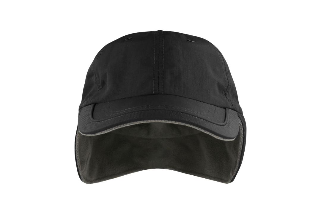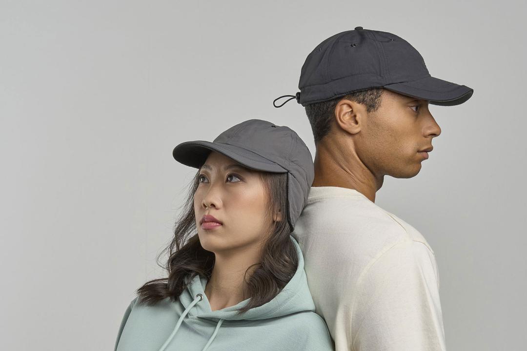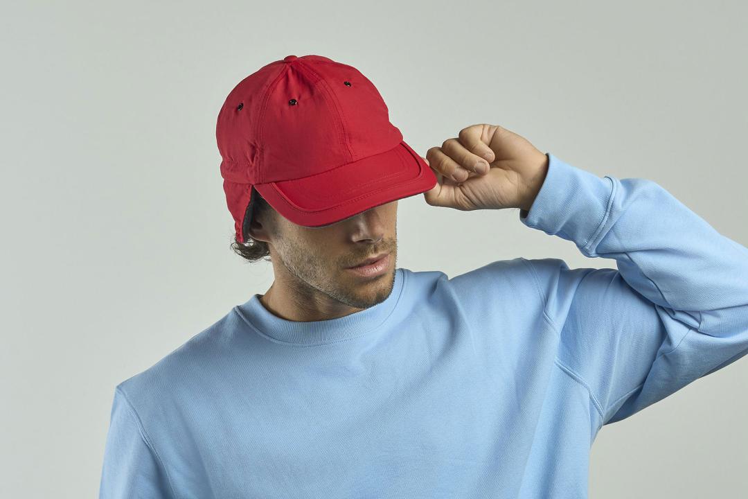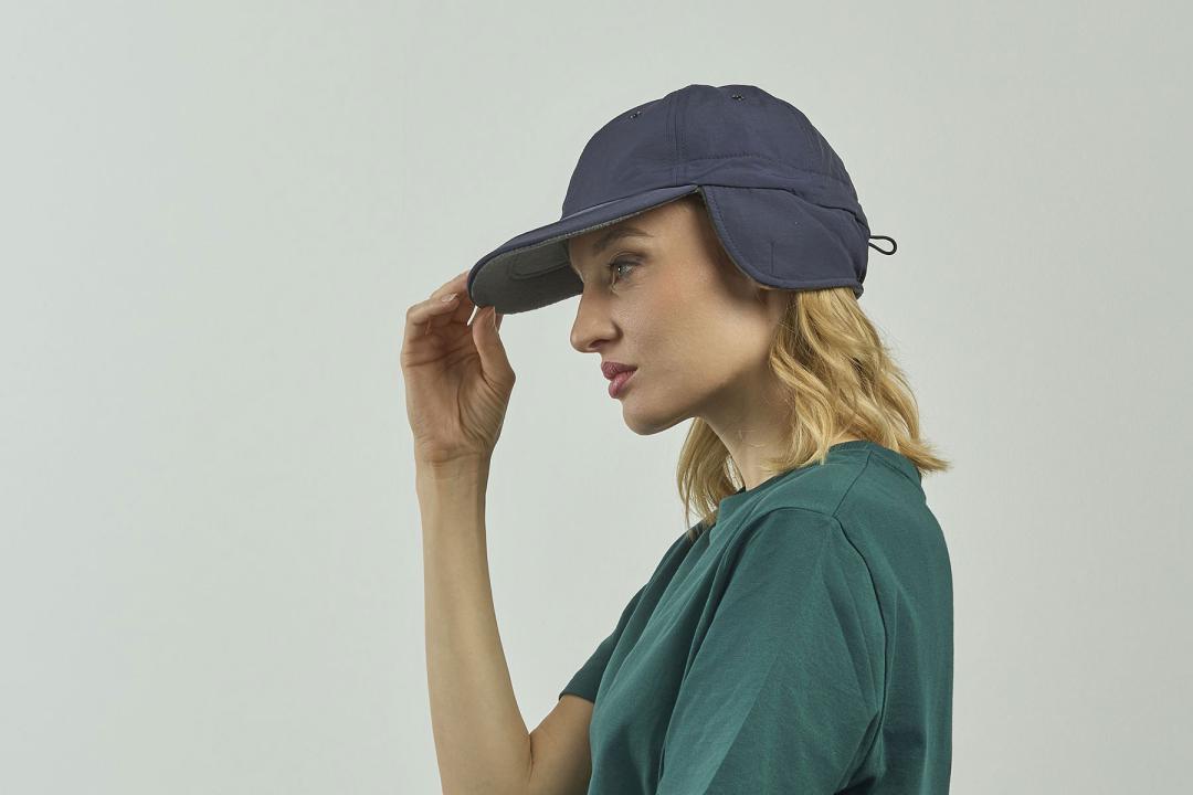 Outdoor winter hat with ear flaps made of recycled nylon. Water repellent outside and recycled polar fleece inside. Unstructured front panels and curved visor. Adjustable closure with elastic drawstrings and stopper.