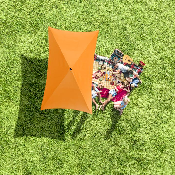 Moderner, rechteckiger Sonnenschirm mit Gestell in Titan-Finish, Knickvorrichtung und mit Volant