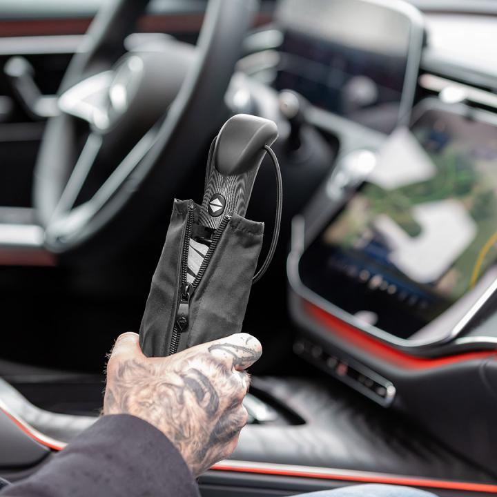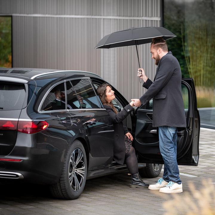 Äußerst stabiler Doppelautomatik-Taschenschirm in Übergröße mit Griff in edler Carbon-Optik