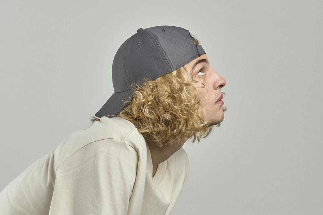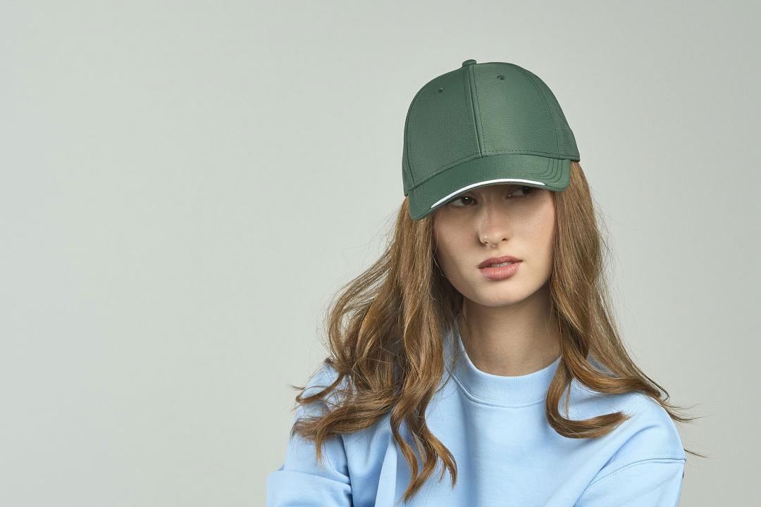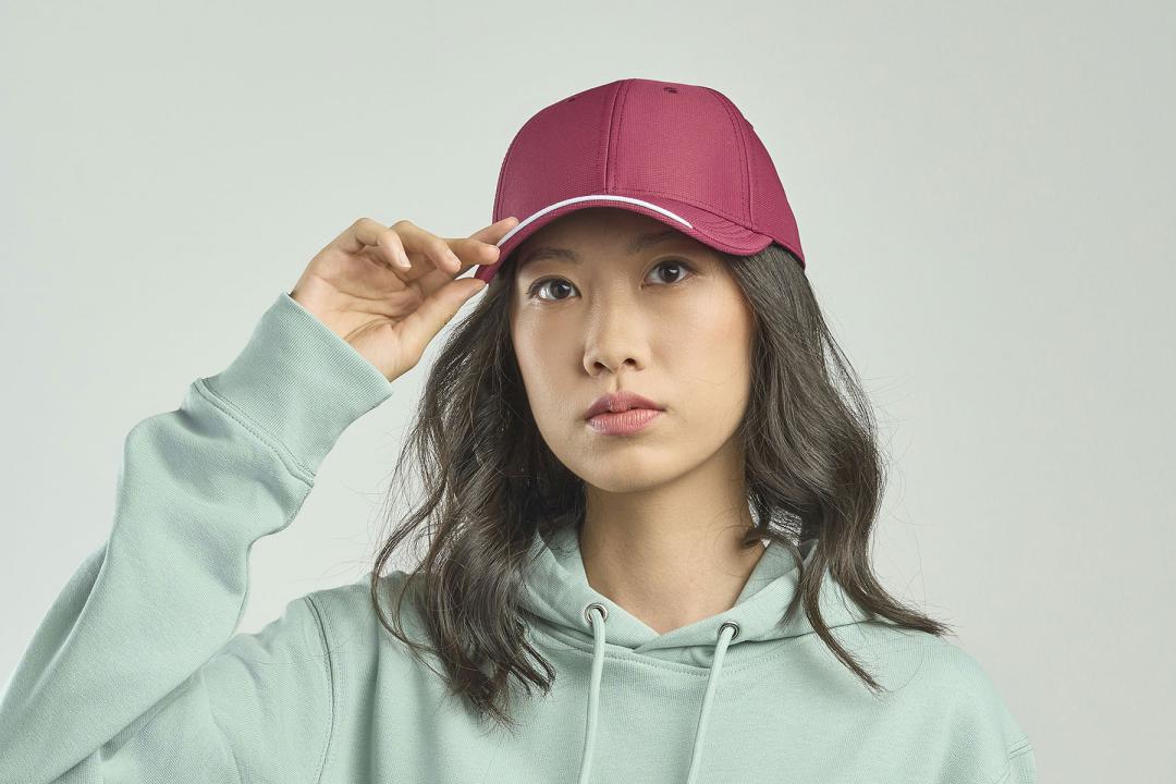 Classic automotive cap revisited in recycled polyester jacquard. Structured shape with HQ hook-and-loop closure with plastic hole. Curved visor with contrasting piping insert, typical of the automotive world.