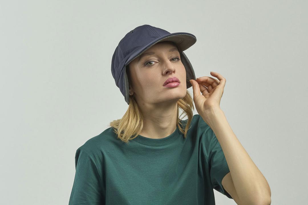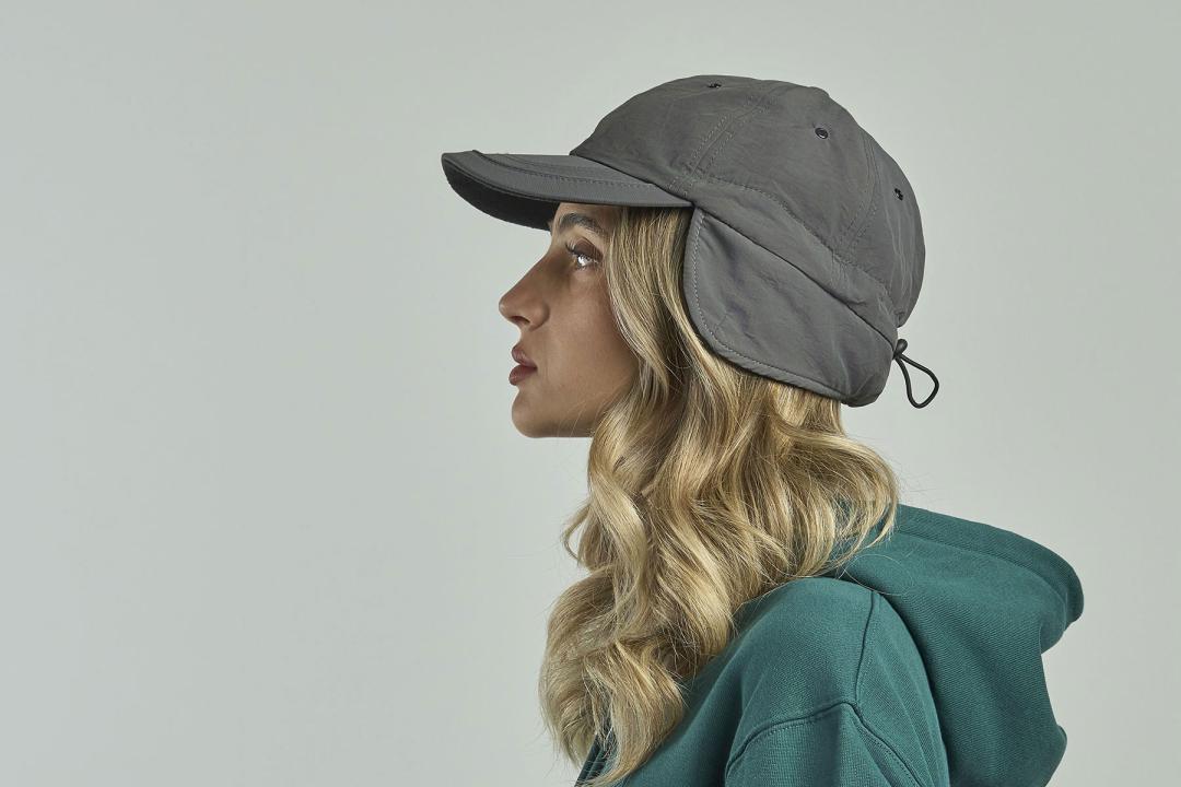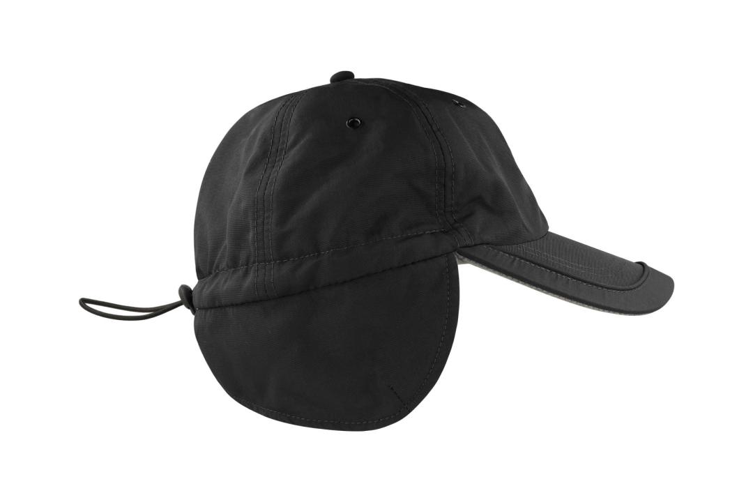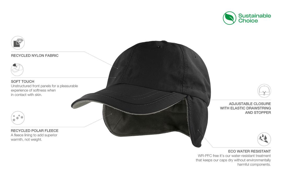 Outdoor winter hat with ear flaps made of recycled nylon. Water repellent outside and recycled polar fleece inside. Unstructured front panels and curved visor. Adjustable closure with elastic drawstrings and stopper.
